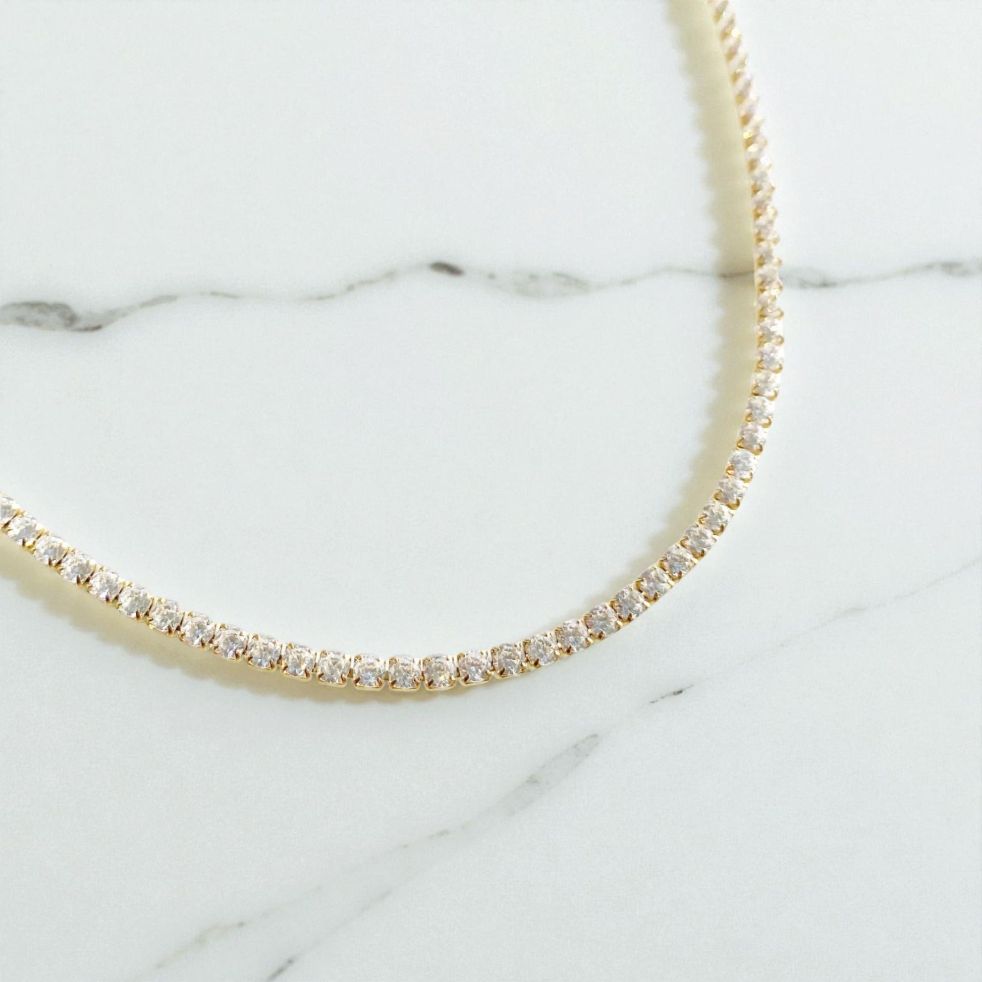Shimmering and versatile, The Dora features a delicate crystal cup chain. Wear alone for subtle sparkle or layer with The Elizabeth and a pendant for a curated, statement party look.