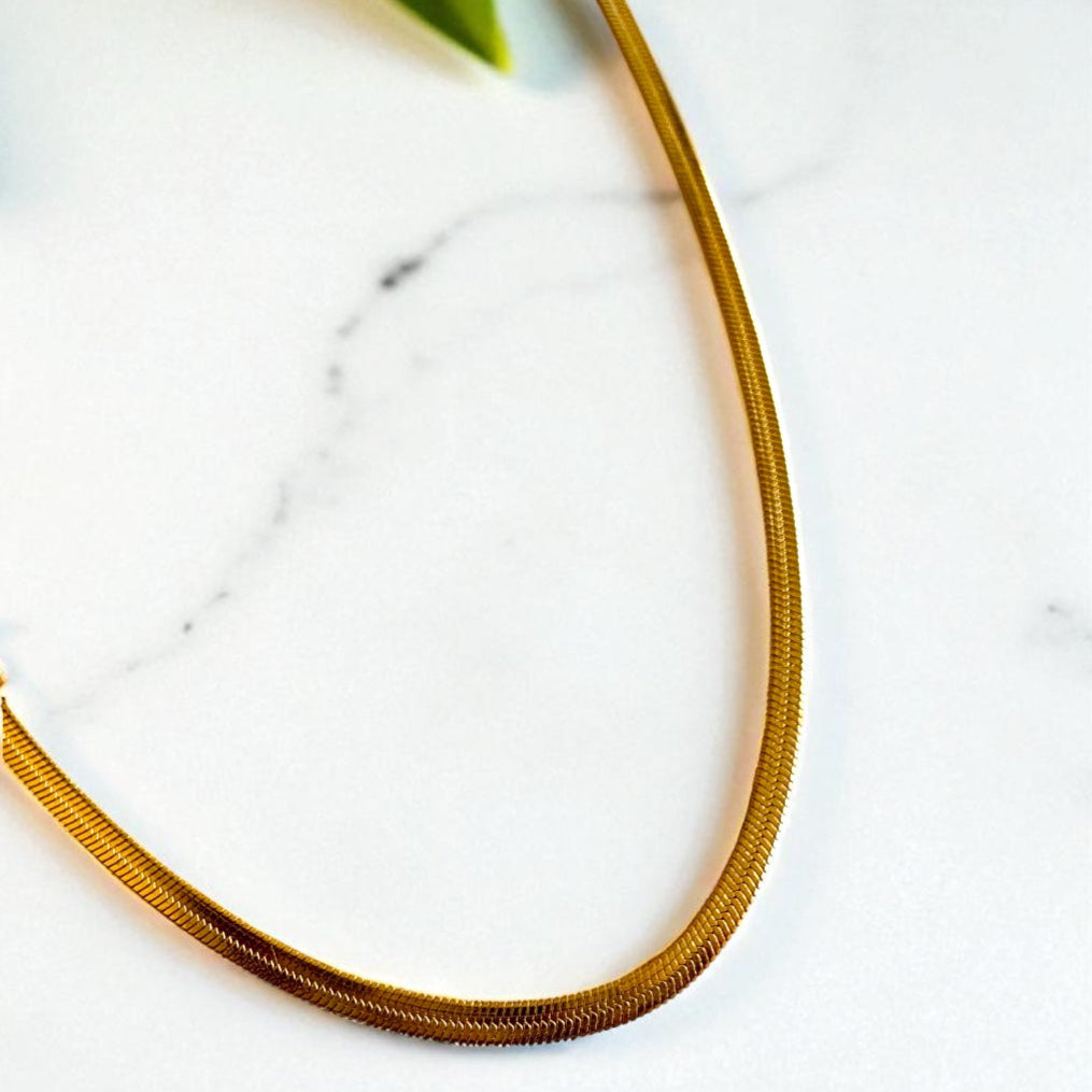 A modern take on a classic, The Emily features a slightly wider slinky snake chain for subtle presence. Its polished finish makes it versatile enough to wear alone or layered with other chains.